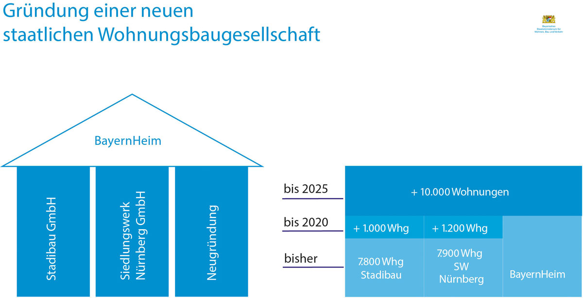 Auch der Freistaat steigt ins Baugeschäft ein. Noch vor der Sommerpause will Staatsministerin Aigner eine staatseigene Wohnungsbaugesellschaft "BayernHeim“ gründen. Aigner: "Das neue Unternehmen soll Wohnraum gerade für niedrigere Einkommensgruppen schaffen, die sich auf dem angespannten Wohnungsmarkt nicht angemessen versorgen können.“ Als Geschäftssitz der neuen Gesellschaft sind Räume am Karl-Scharnagl-Ring 6-8 vorgesehen. Rund 20 Mitarbeiter sollen hier ab Juli ihre Arbeit aufnehmen. Die neue staatliche Gesellschaft soll vorranging staatseigene Flächen bebauen. Durch ein gezieltes Flächenmanagement will Aigner deshalb den Grundstücksbestand des Freistaats prüfen lassen. Nach ersten Voruntersuchungen konnte die beim Bauministerium angesiedelte Immobilien Freistaat Bayern (IMBY) bebaubare Flächen von fast 20 Hektar identifizieren. Die Wohnungsbaugesellschaft soll diese Flächen als erstes in Angriff nehmen. Aigner fordert außerdem vom Bund, dass die Bundesimmobilienanstalt (BIMA) bei Verkauf und Pacht von bundeseigenen Flächen und Immobilien -wie beispielsweise Kasernen- die Nutzung von sozialem Wohnungsbau prioritär behandelt.