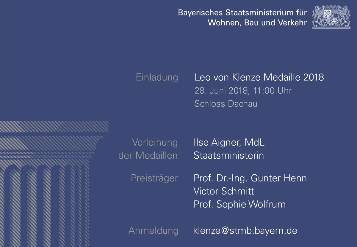 Bitte melden Sie sich unter klenze@stmb.bayern.de zur Verleihung der Leo-von-Klenze-Medaille an.