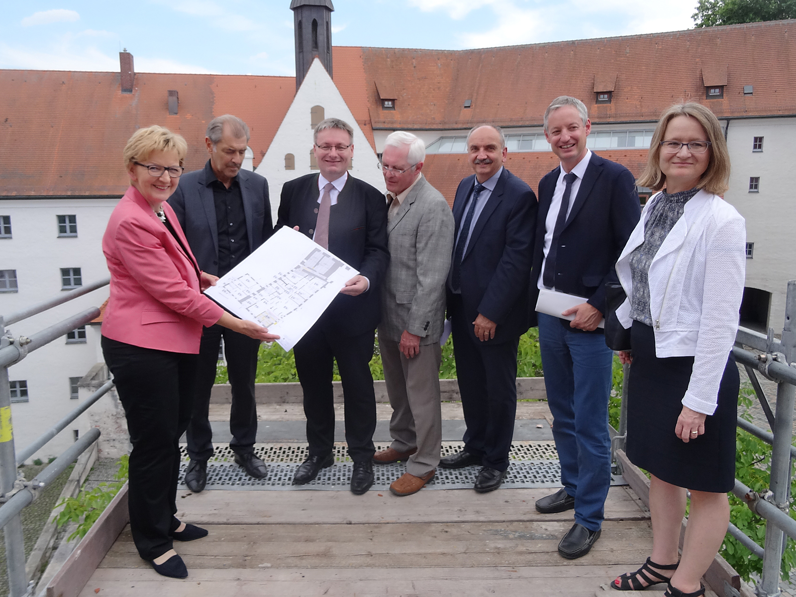 Finanzamtleiterin Elisabeth Karlstetter und Oberstaatsanwalt Klaus-Dieter Fiedler sind froh, dass die über acht Monate dauernde Bauzeit nun vorüber ist. Für das Personal von Finanzamt und Staatsanwaltschaft waren die lauten Zimmererarbeiten bei laufendem Betrieb immer wieder belastend, aber am Ende überwiegt die Freude über die gelungene Sanierung. Der Weg führte anschließend hinauf auf das Baugerüst im Innenhof des Herzogschlosses auf Höhe der Dachtraufe. Beim Blick auf die inzwischen weitgehend sanierte Dachlandschaft zeigte sich Baustaatssekretär Zellmeier beeindruckt vom Umfang und der Qualität der durchgeführten Arbeiten am Herzogschloss Straubing. „Als Baustaatssekretär ist mir die Erhaltung und Modernisierung unserer staatlichen Gebäude ein besonderes Anliegen, vor allem hier in meiner Heimatregion“, so Staatssekretär Zellmeier. Daher wolle er sich für die Bereitstellung der erforderlichen Haushaltsmittel einsetzen, damit auch die Sanierung der Reitertreppe und der Innenausbau des Westturms begonnen werden können.