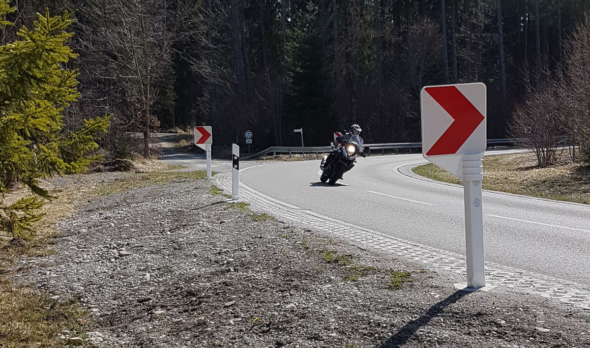 München, 18. April 2019 (stmb). Die Temperaturen steigen und die Tage werden länger. An sonnigen Wochenenden sind dementsprechend auch wieder vermehrt Motorradfahrer auf Bayerns Straßen unterwegs. Um deren Sicherheit zu erhöhen, startet das Bayerische Verkehrsministerium ein neues Pilotprojekt: Richtungstafeln, die den Verlauf scharfer Kurven markieren, werden auf ausgewählten Motorradstrecken nicht mehr aus Metall, sondern aus Kunststoff angebracht.