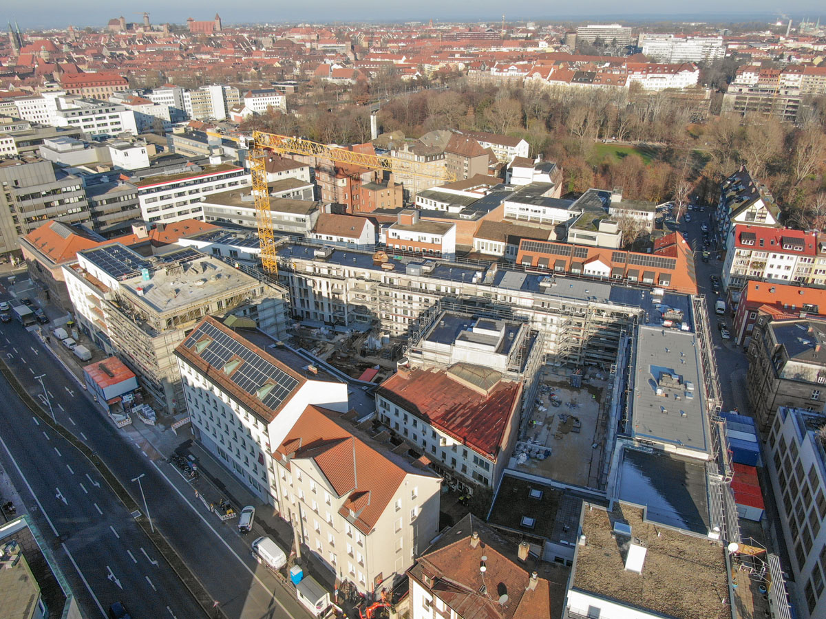 Das trapezförmige Grundstück liegt in der zentralen Nürnberger Marienvorstadt, in einem der ersten Gründerzeitviertel außerhalb der Stadtmauer im Osten der Altstadt und reicht bis an die Marienstraße, einer Haupteinfallstraße von Südosten in die Altstadt. In dem Quartier, das bestens angebunden ist, entstehen insgesamt 136 Wohnungen auf mehr als 9.800 Quadratmetern Wohnfläche. Für die neuen Anwohner sind mehr als 200 Tiefgaragenplätze geplant. Auch neun Gewerbeeinheiten mit attraktiven Büros, Kleingewerbe und Café sind vorgesehen.