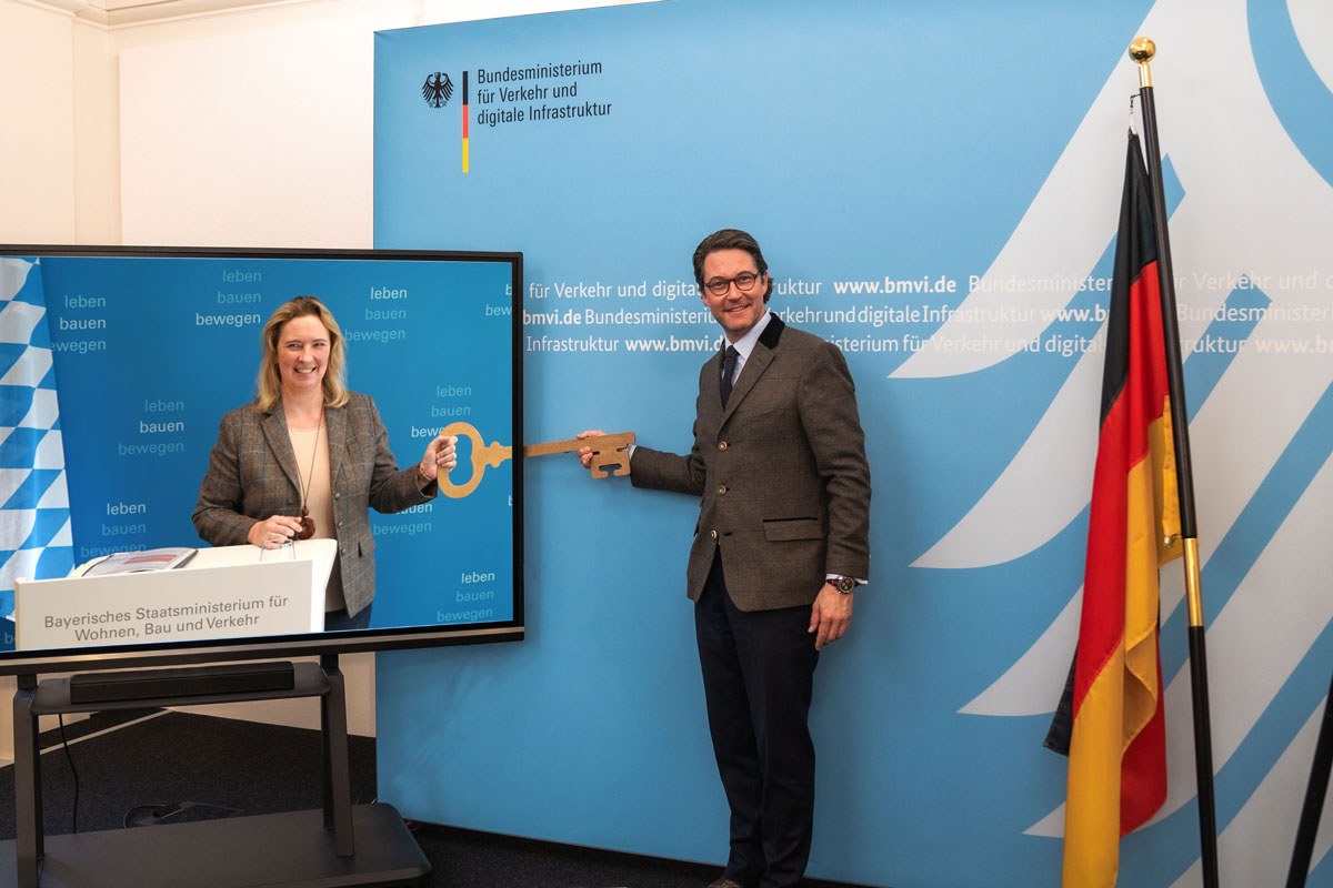 Durch die bundesweite Reform der Autobahnverwaltung geht eine über sieben Jahrzehnte lange Geschichte der Auftragsverwaltung für die Autobahnen durch die Länder zu Ende. Heute hat Bayerns Verkehrsministerin Kerstin Schreyer im Rahmen eines digitalen Festaktes die Schlüssel für die beiden ehemaligen Autobahndirektionen Nord- und Südbayern symbolisch an Bundesverkehrsminister Andreas Scheuer übergeben.