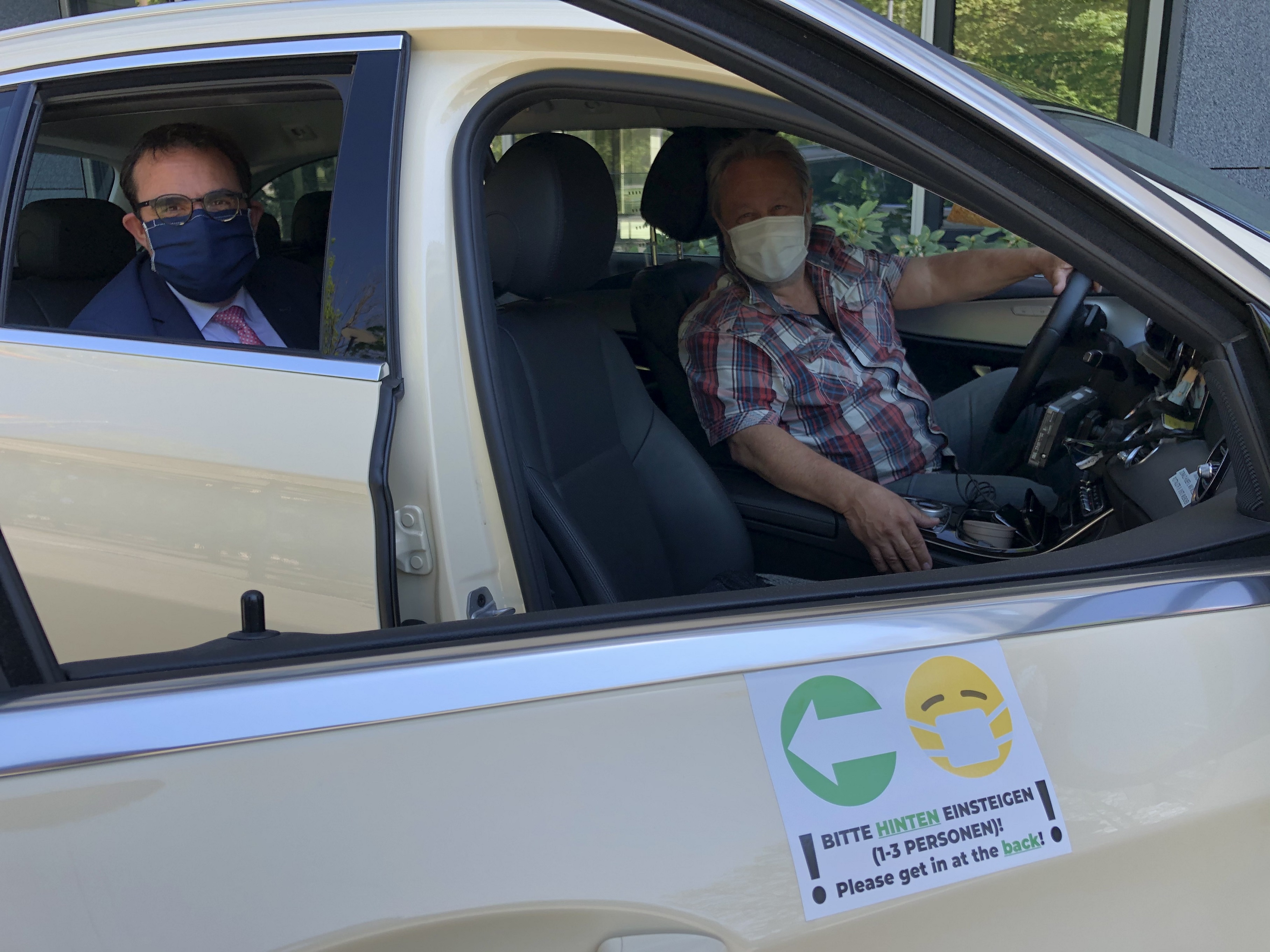 Foto im Taxi: Verkehrsstaatssekretär Klaus Holetschek bittet die Fahrgäste: „Halten Sie Abstand und steigen Sie immer hinten ins Auto ein.“