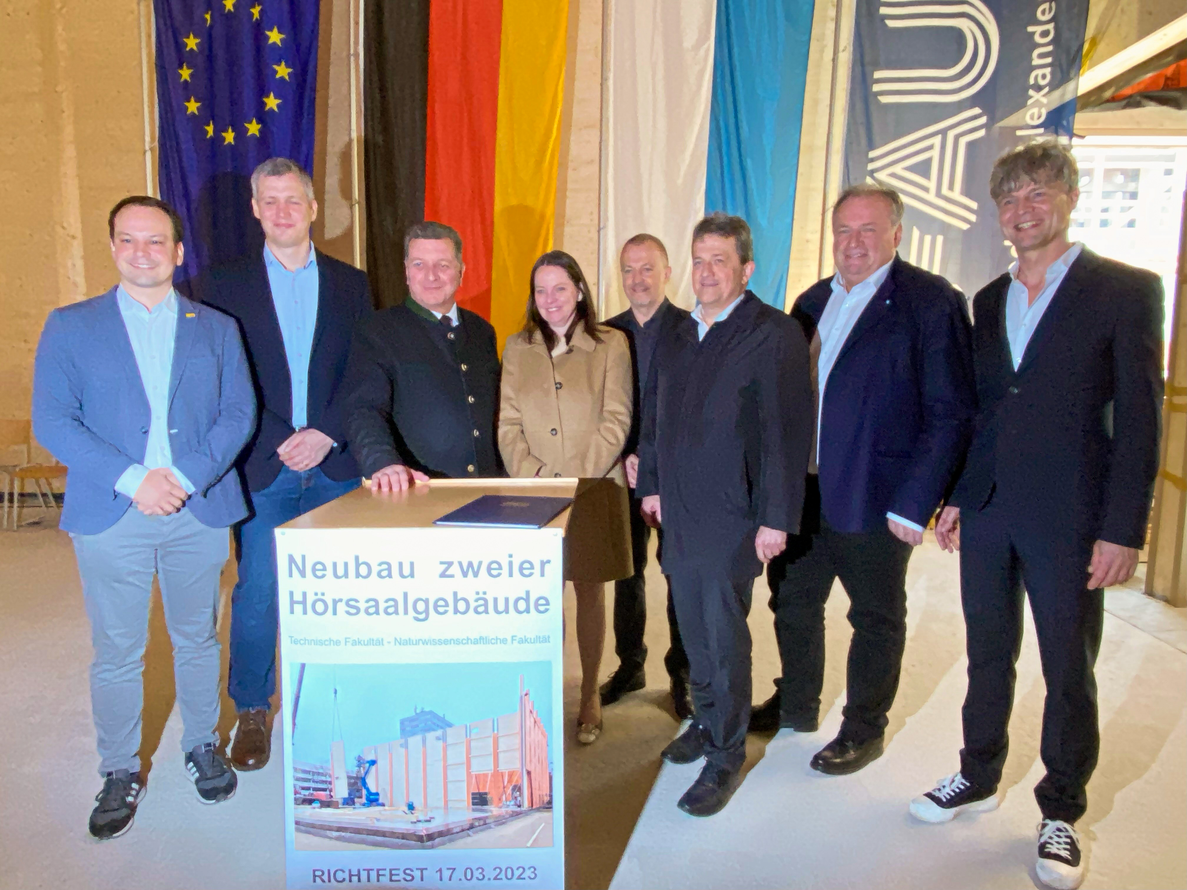 Die Friedrich-Alexander-Universität bildet zusammen mit den Unternehmen der Region ein wissenschaftliches und wirtschaftliches Kraftzentrum in Bayern und leistet einen wesentlichen Beitrag dazu, dass Bayern führend bei Wissenschaft und Forschung ist. Mit insgesamt 1,5 Milliarden Euro investiert der Freistaat kräftig in die weitere Stärkung dieses Wissenschaftsstandorts. Teil dieser Investitionen ist der weitere Ausbau der Technischen Fakultät am Südgelände der Universität. Nach den bereits fertiggestellten, gemeinsam mit dem Bund finanzierten Forschungsneubauten für das Exzellenzcluster gehen nun auch der Bau von zwei neuen Hörsaalgebäuden auf die Zielgerade. Zusammen mit dem Vizepräsidenten der Universität, Prof. Dr. Andreas Hirsch, weiteren Vertretern der Universität, des Staatlichen Bauamts Erlangen-Nürnberg, der beteiligten Architektur- und Planungsbüros sowie der Baufirmen feierte Bayerns Bauminister Christian Bernreiter heute das Richtfest.