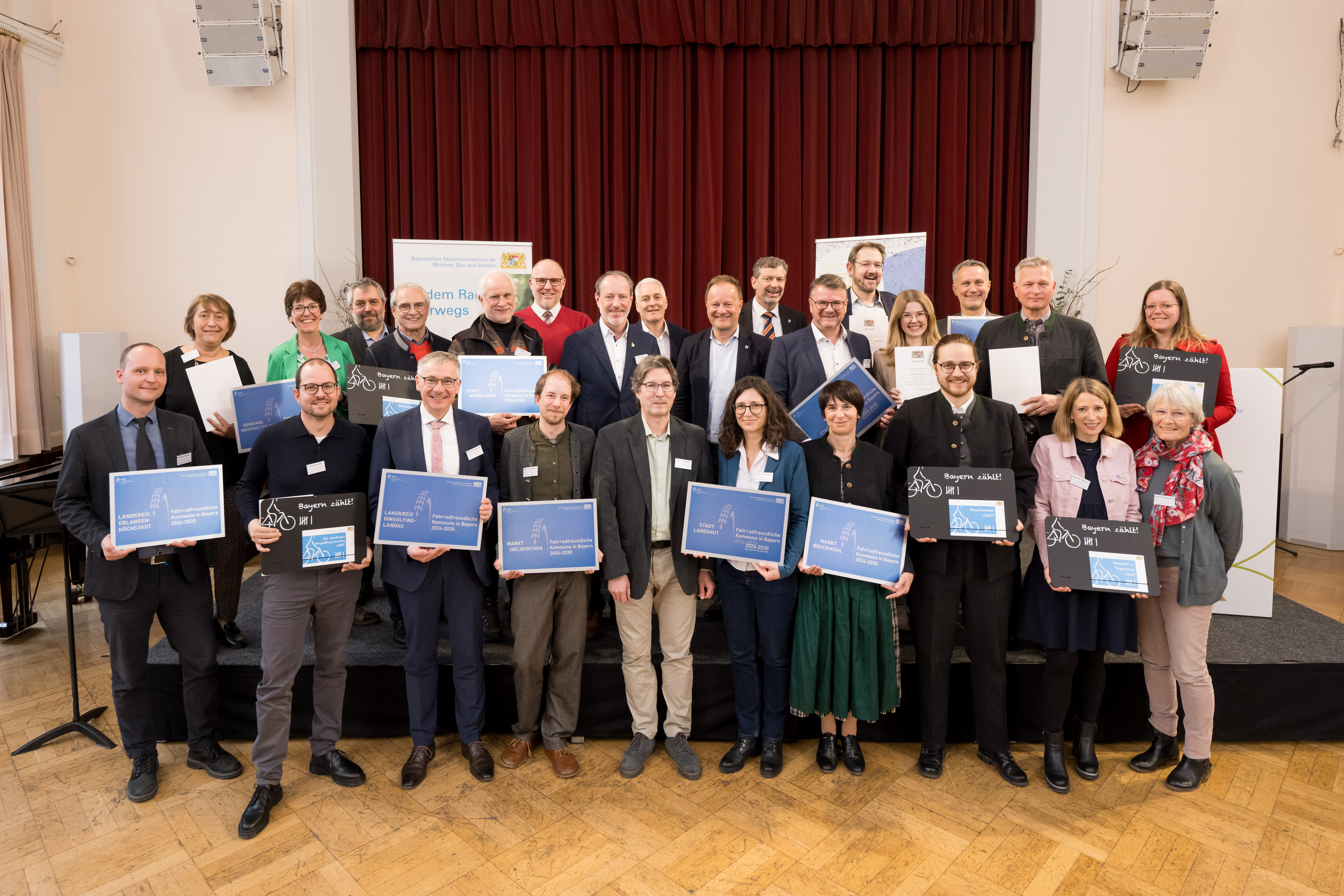 Voraussetzung für eine dauerhafte Mitgliedschaft in der AGFK Bayern ist die Auszeichnung als „Fahrradfreundliche Kommune in Bayern“, die vom Bayerischen Staatsministerium für Wohnen, Bau und Verkehr verliehen wird. Im Prüfverfahren für die Auszeichnung werden die Kommunen nach einem einheitlichen Kriterienkatalog auf ihre Fahrradfreundlichkeit geprüft. Acht AGFK-Mitgliedskommunen haben sich dem anspruchsvollen Verfahren mit Erfolg unterzogen und dürfen von 2024 bis 2030 offiziell den Titel tragen: Die Städte Friedberg und Mindelheim, die Gemeinden Gmund a. Tegernsee und Neuendettelsau, die Märkte Bruckmühl und Holzkirchen sowie die Landkreise Dingolfing-Landau und Erlangen-Höchstadt. Dr. Thomas Gruber und Robert Niedergesäß überreichten ihnen feierlich die Auszeichnungen. Insgesamt tragen den Titel „Fahrradfreundliche Kommune in Bayern“ inzwischen 70 Kommunen. Die Auszeichnung ist ein Anreiz, den eingeschlagenen Weg weiterzuverfolgen.
