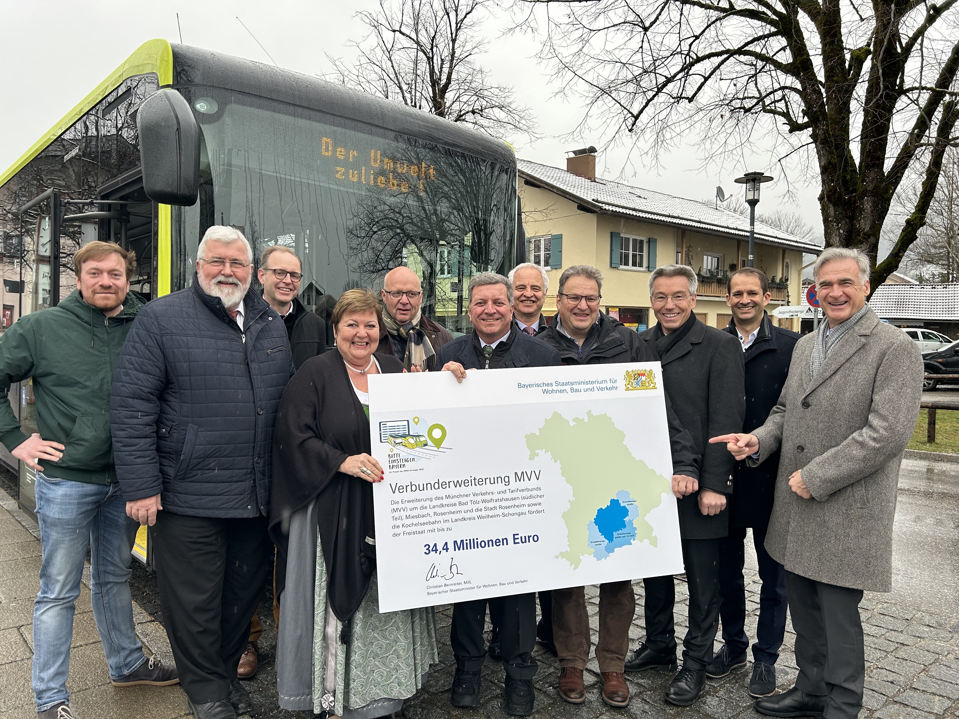 Es ist eine der wichtigsten verkehrspolitischen Maßnahmen der letzten Jahre in Oberbayern: Mit dem Beitritt der Landkreise Bad Tölz-Wolfratshausen, Miesbach, Rosenheim und der Stadt Rosenheim ist der Münchner Verkehrs- und Tarifverbund (MVV) zum 10. Dezember 2023 um eine halbe Million Menschen gewachsen. Gleichzeitig wurde die Kochelseebahn im Landkreis Weilheim-Schongau in den MVV integriert. Der Freistaat Bayern hat mit dem Förderprogramm zur Schaffung flächendeckender Verbundstrukturen die Erweiterung ermöglicht und finanziert auch einmalige und dauerhafte Kosten mit bis zu 90 Prozent. Bayerns Verkehrsminister Christian Bernreiter hat Landrätin Andrea Jochner-Weiß aus Weilheim-Schongau, den Landräten Josef Niedermaier aus Bad Tölz-Wolfratshausen, Olaf von Löwis of Menar aus Miesbach, Otto Lederer aus dem Landkreis Rosenheim und Oberbürgermeister Andreas März aus der Stadt Rosenheim heute am Bahnhof Lenggries einen symbolischen Förderbescheid über 34,4 Millionen Euro überreicht.
