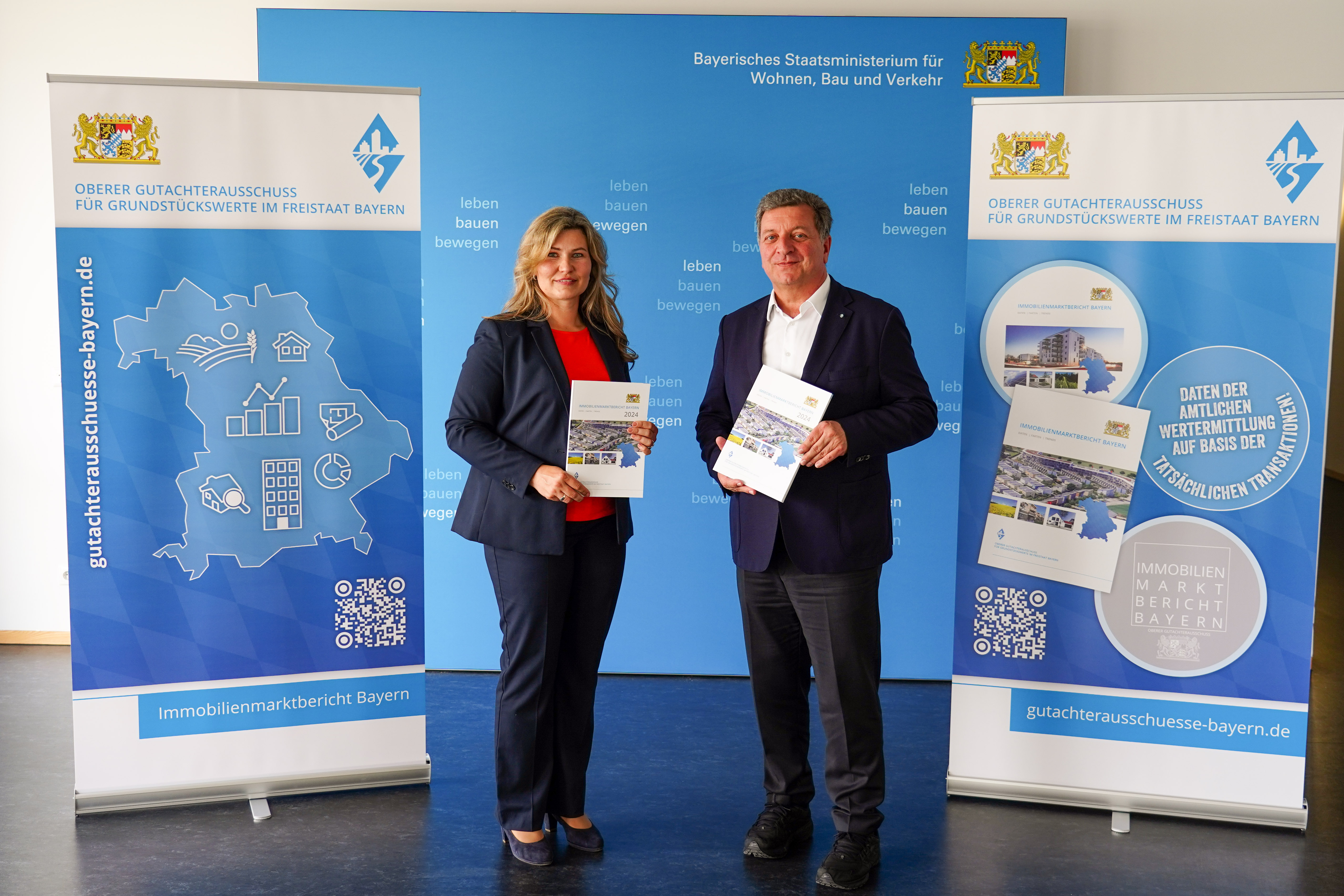 Bayerns Bauminister Christian Bernreiter und die Vorsitzende des Oberen Gutachterausschusses Gudrun Eder bei der Vorstellung des Immobilienmarktberichts Bayern 2024. (Quelle: StMB)